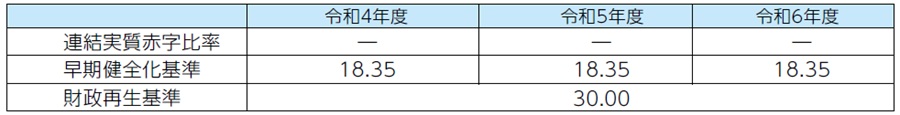 標準財政規模に対する、公営事業を含む地方公共団体の全会計の実質赤字の比率であり、地方公共団体全体における赤字の深刻度を表しています。令和6年度の全会計の連結実質収支は黒字であり、連結実質赤字比率は該当せず、財政の健全性を表しています。
