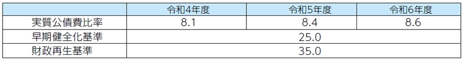 標準財政規模に対する、公債費(借入金の元利償還金)及び公債費に準じた経費の比率の3か年平均であり、数値が大きいほど資金繰りが悪化していることを表します。また、実質公債費比率が18%以上になると、地方債を発行する場合に都道府県知事の許可を受けなければならず、25%以上になると、地方債の発行が制限されます。令和6年度決算に基づく実質公債費比率は8.6%で早期健全化基準を下回り、財政の健全性を表しています。