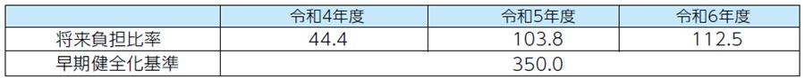 標準財政規模に対する、地方債(借入金)残高のほか一般会計等が将来負担すべき実質的な負債の比率であり、数値が大きいほど将来財政を圧迫する可能性が高いことを表します。令和6年度決算に基づく将来負担比率は112.5%で、早期健全化基準を下回り、財政の健全性を表しています。