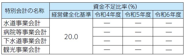 公営企業ごとの事業規模に対する資金不足額の比率であり、数値が大きいほど経営状態が悪化していることを表します。令和6年度の全ての会計において、資金不足額は生じていません。