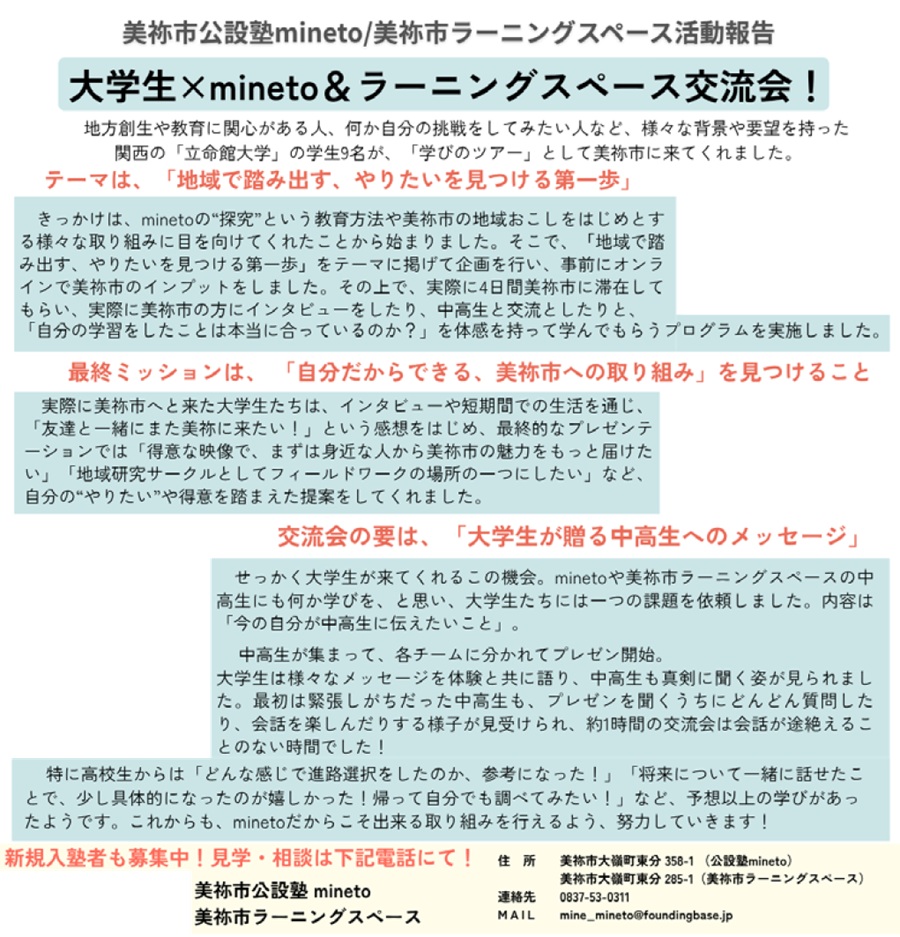 子育て 美祢市公設塾mineto・美祢市ラーニングスペースからのお知らせ 25/29 前の記事 次の記事 発行日 : 2025年11月01日 自治体名 : 山口県美祢市 広報紙名 : 広報げんきみね。 2025年11月1日 No260 Tweet シェアする 秋吉台国際芸術村イベント情報 みらい そうぞう まちづくりプロジェクト