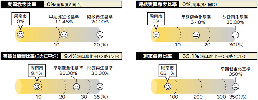 令和6年度決算における本市の健全化判断比率は、全ての指標で早期健全化基準を下回っています。公営企業も、全ての会計で資金不足は発生していません。今後も、公債費の抑制、償還期間の見直しによる負担の平準化により、地方債残高および元利償還金の低減を図ります。