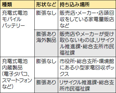 充電式電池の「リチウムイオン電池」は、強い力が加わると発熱し、発火することがあります。誤った方法で処分すると、ごみ収集車や処理施設の火災の原因となるので、適切に処分しましょう。