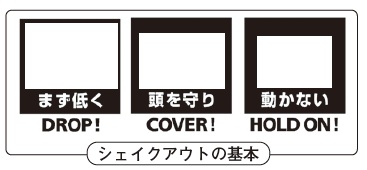 シェイクアウト訓練とは、地震動を予知又は知覚した場合に、地震動や落下物等から身を守る行動として、「まず低く」「頭を守り」「動かない」という動作を反射的に行えるように訓練するものです。