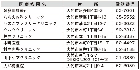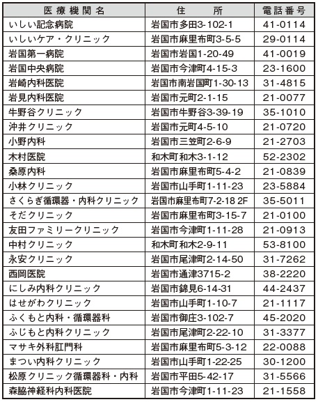 和木町及び岩国市、大竹市内の以下の医療機関で受診することができます。