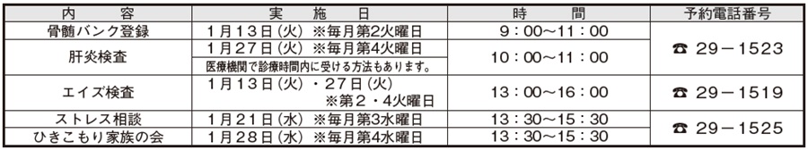 健康 岩国健康福祉センター(保健所)の相談会・検査等予定 11/37 前の記事 次の記事 発行日 : 2026年01月01日 自治体名 : 山口県和木町 広報紙名 : 広報わき 令和8年1月号 No.634 住所:岩国市三笠町1-1-1 いずれも無料でご利用いただけます。予約電話番号までご連絡ください。 Tweet シェアする からだ応援ページ 岩国税務署からのお知らせ