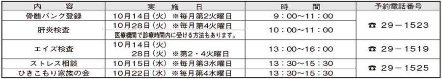 健康 岩国健康福祉センター(保健所)の相談会・検査等予定 9/40 前の記事 次の記事 発行日 : 2025年10月01日 自治体名 : 山口県和木町 広報紙名 : 広報わき 令和7年10月号 No.631 住所:岩国市三笠町1-1-1 いずれも無料でご利用いただけます。予約電話番号までご連絡ください。 Tweet シェアする 子育て掲示板 からだ応援ページ