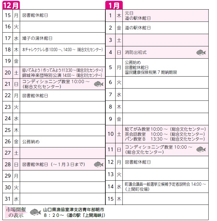 くらし まちのカレンダー《12月15日~1月15日》 26/30 前の記事 次の記事 発行日 : 2025年12月11日 自治体名 : 山口県上関町 広報紙名 : 広報かみのせき 令和7年12月号 ※予定ですので、日時の変更や中止の場合があります。 Tweet シェアする 国際電話は危険? 利用休止できます! 道の駅 上関海峡