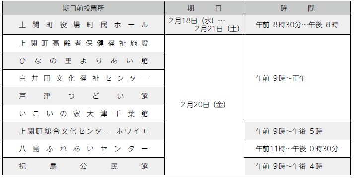 期日前投票ができる期間は、告示日の翌日(2月18日(水))から投票日の前日(2月21日(土))までです。期日前投票所によって投票できる日時が違いますので、次頁の日程表を参照してください。