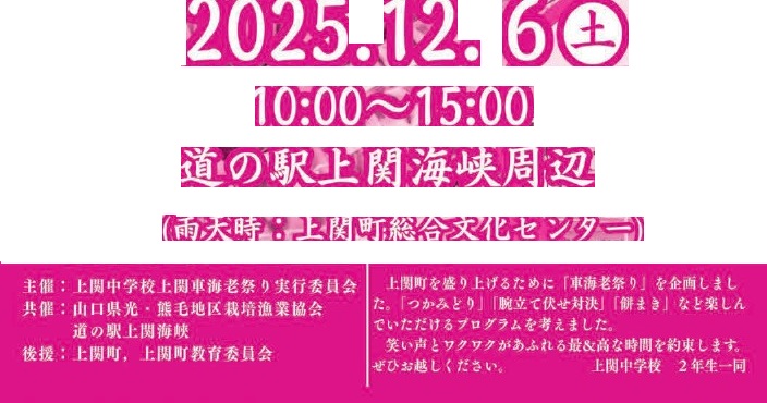 イベント 上関町 車海老祭り 1/32 次の記事 発行日 : 2025年11月13日 自治体名 : 山口県上関町 広報紙名 : 広報かみのせき 令和7年11月号 ■上関町車海老祭りプログラム Tweet シェアする サザンセト マッチングイベント in 上関町