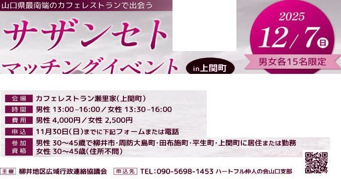 イベント サザンセト マッチングイベント in 上関町 2/32 前の記事 次の記事 発行日 : 2025年11月13日 自治体名 : 山口県上関町 広報紙名 : 広報かみのせき 令和7年11月号 Tweet シェアする 上関町 車海老祭り 健康コーナー