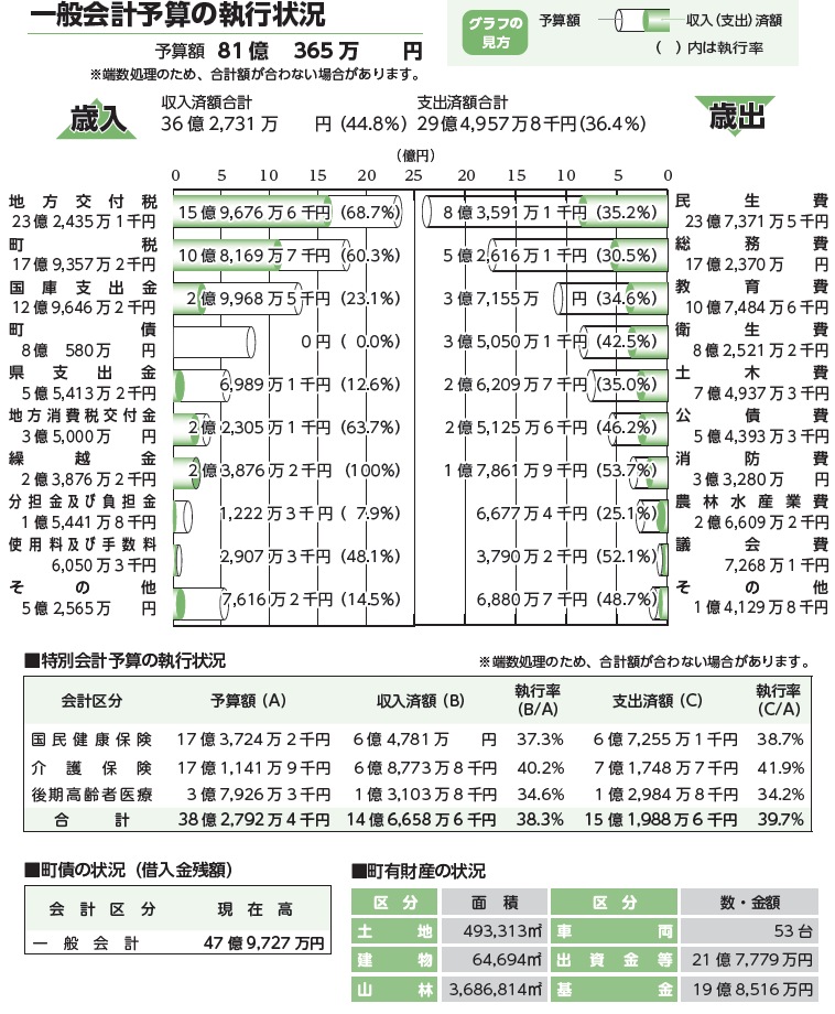 9月末現在の予算額は、前年度からの繰越予算額を加算し、一般会計が81億365万円、特別会計が38億2,792万4千円となっています。