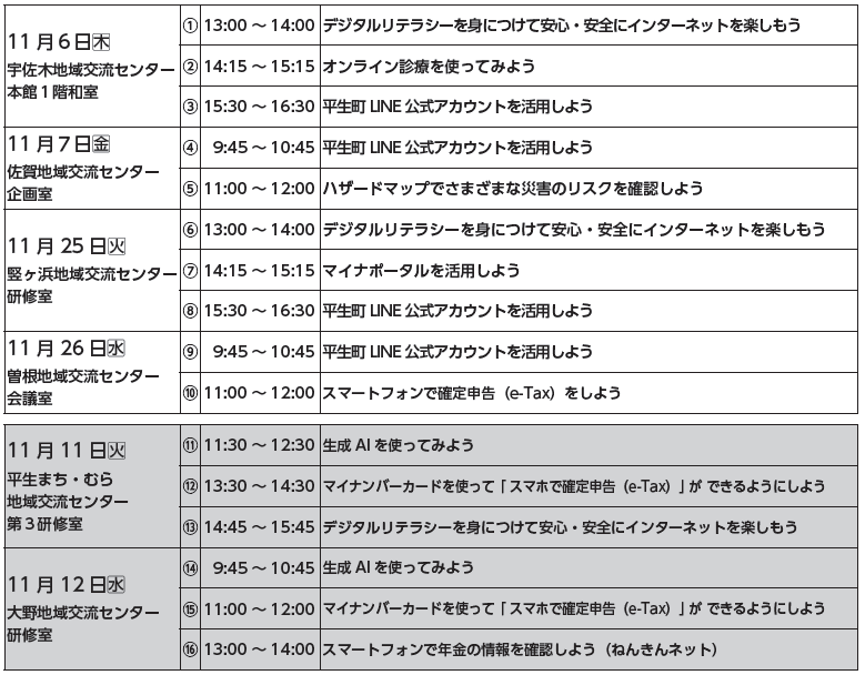 ※この教室は、町が(株)ホームラン((1)~(10))およびMXモバイリング(株)((11)~(16))にそれぞれ委託して実施するものです。