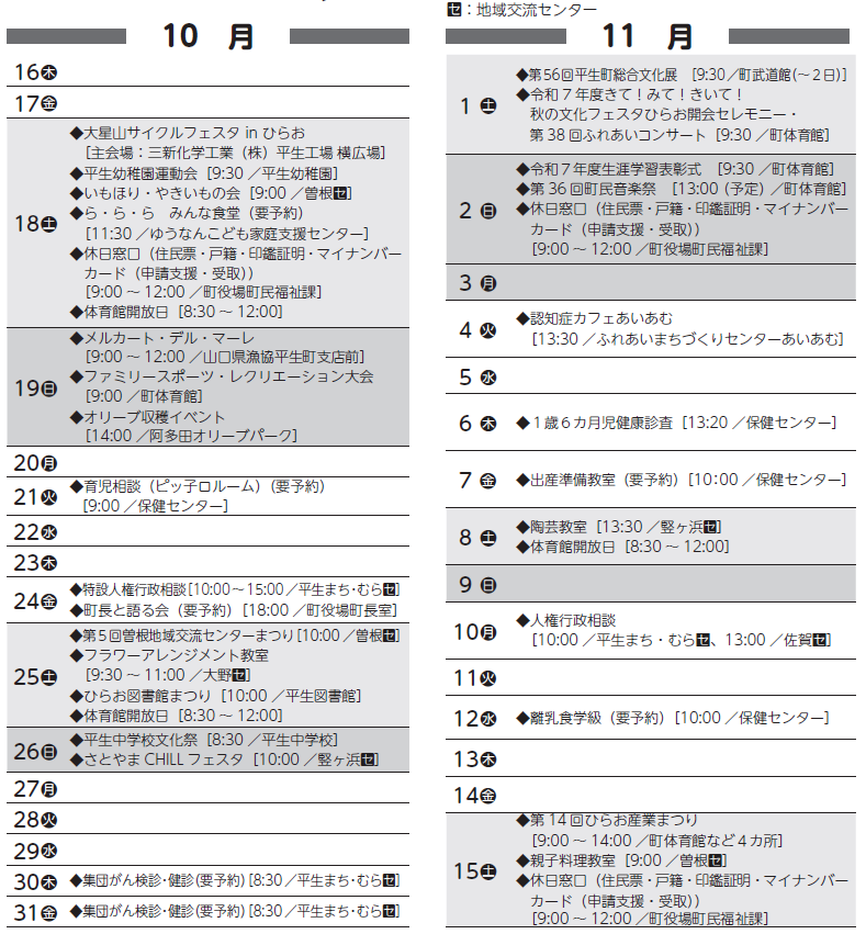 くらし まちのカレンダー 41/44 前の記事 次の記事 発行日 : 2025年10月10日 自治体名 : 山口県平生町 広報紙名 : 広報ひらお 令和7年(2025年)10月号 No.1362 ※予定表のため、変更となる場合があります。 ※町長と語る会は、実施1週間前までにご予約ください。 Tweet シェアする まちの人口 8月31日現在 わが家のアイドル お誕生日おめでとう!