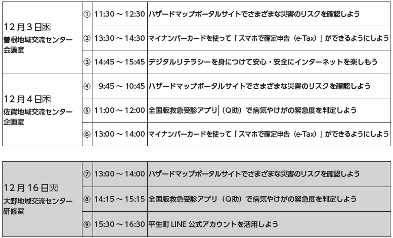 ※この教室は、町がMXモバイリング(株)((1)~(6))および(株)ホームラン((7)~(9))にそれぞれ委託して実施するものです。