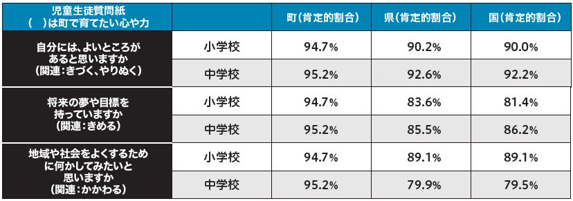 総合的に見ると、小・中学校ともに、自己肯定感、夢・目標、地域貢献意欲(あぶPRIDEの根幹)が約95%と高い水準で定着し、県や全国平均を大幅に上回る顕著な成果が見られました。