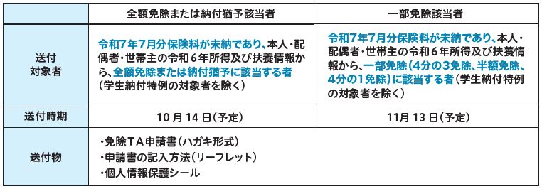 国民年金保険料の免除または納付猶予に該当する対象者へ、令和7年度の「国民年金保険料免除・納付猶予申請書(ターンアラウンド様式)(以下「免除TA申請書」という。)」が以下の通り、送付されます。