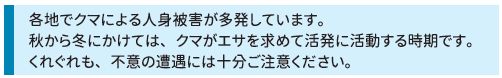 ・出没情報に留意し、特に行動が活発になる早朝、夕方の作業時には周囲に気を付けること。
