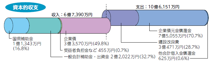 資本的収支では、下水道施設を建設したり改良したりするための支出と、その財源にあたる補助金や企業債などの収入を経理しています。支出に対して不足する額は、内部留保資金(減価償却費などの現金の支出を伴わない費用で、企業内部に残っている資金)で補てんしました。