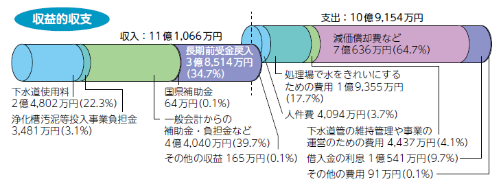 収益的収支では、家庭から出た汚水を処理してきれいにしたり下水道管を維持管理したりするための費用と、その財源にあたる下水道使用料や補助金などの収益を経理しています。