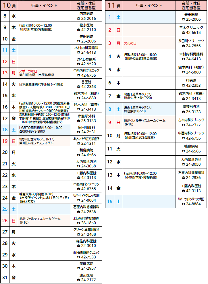 ・吉野川医療センター(【電話】26-2222) 第2・第4日曜日午前中