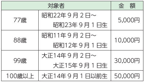 対象者:令和7年9月1日現在において、阿波市に住民登録があり、引き続き1年以上居住している77歳、88歳、99歳、100歳以上の方