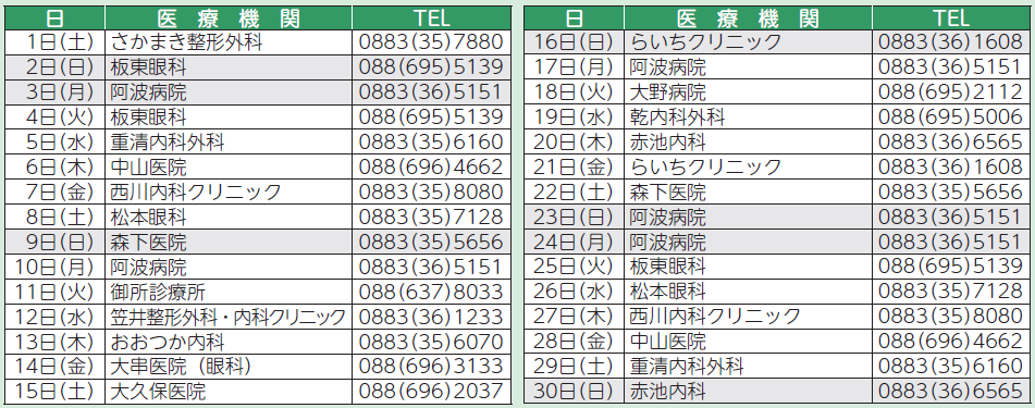 ※当番医、または中央広域連合中消防署〔【電話】088-695-2149〕で必ずご確認の上、受診してください。変更になる場合があります。