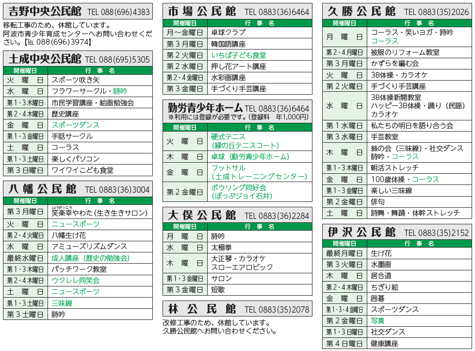 講座 11月公民館・勤労青少年ホーム行事予定表 21/43 前の記事 次の記事 発行日 : 2025年11月01日 自治体名 : 徳島県阿波市 広報紙名 : 広報あわ 2025年11月号 どなたでも参加できます。開催日時などは変更されることがありますので、各施設へお問い合わせください。 17時以降開始の行事は、緑色で記しています。 Tweet シェアする 気をつけよう!消費者トラブル 阿波市ケーブルネットワーク