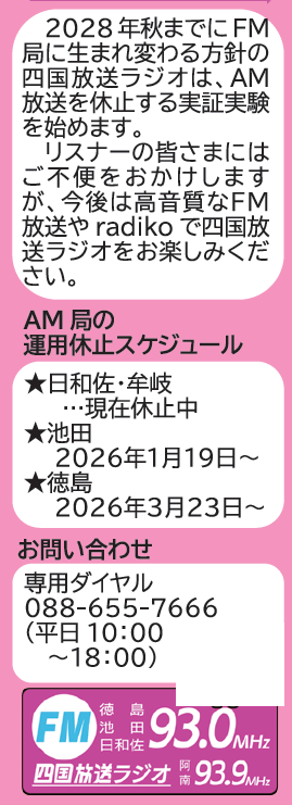くらし 四国放送ラジオはAMからFMへ! 19/38 前の記事 次の記事 発行日 : 2026年01月15日 自治体名 : 徳島県石井町 広報紙名 : 広報いしい 第283号(2026年1月) Tweet シェアする 阿波の名工 入学支度金を支給します