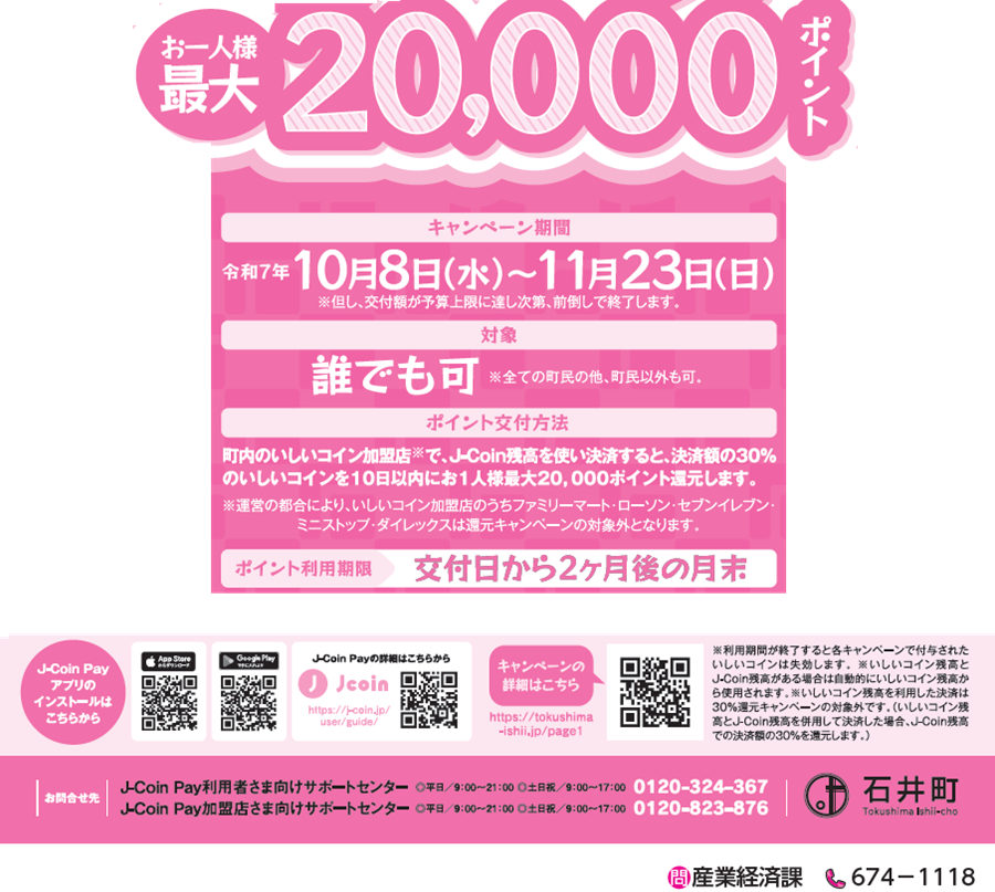 くらし 石井町デジタル地域通貨 いしいコイン 30%還元キャンペーン 10/40 前の記事 次の記事 発行日 : 2025年10月15日 自治体名 : 徳島県石井町 広報紙名 : 広報いしい 第280号(2025年10月) キャンペーン 第3弾 Tweet シェアする いしい地域情報チャンネル(i-チャンネル) 令和8年度 石井町・教育委員会 会計年度任用職員を募集します!