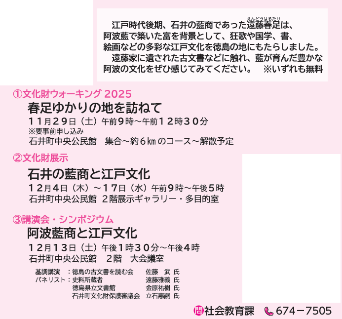 文化 阿波の藍商 遠藤 春足と江戸文化の世界 21/40 前の記事 次の記事 発行日 : 2025年10月15日 自治体名 : 徳島県石井町 広報紙名 : 広報いしい 第280号(2025年10月) 徳島県立文書館連携・石井町文化財行事 Tweet シェアする 令和7年度 敬老会・金婚者激励会 いしい藍玉祭