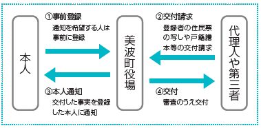 登録手続き:「美波町本人通知制度事前登録申請書」を美波町役場住民生活課もしくは由岐支所・阿部出張所の窓口に提出