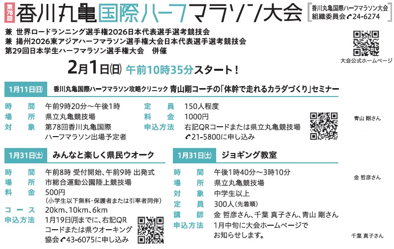 スポーツ 第78回 香川丸電国際ハーフマラソン大会 2/48 前の記事 次の記事 発行日 : 2026年01月01日 自治体名 : 香川県丸亀市 広報紙名 : 広報まるがめ 令和8年1月号 Tweet シェアする 新年のご挨拶 丸亀市市制施行20周年記念式典