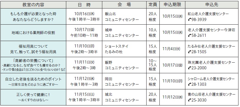 皆さんの困っていることや不安なことを、介護の専門家と一緒に考えてみませんか。現在、介護している家族の人が、気軽に参加できるように、会場までの送迎や家族の預かりなどの相談にも応じます。詳しくは、各申込先にお問い合わせください。