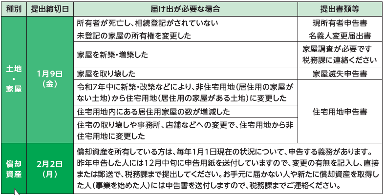 固定資産税は、毎年1月1日(賦課期日)現在で、さぬき市内に土地、家屋、償却資産を所有している人に課税されます。※所有者として登記・登録されている人が、賦課期日前に死亡した場合などには、賦課期日現在でその固定資産を現に所有している人(相続人など)が納めなければなりません。