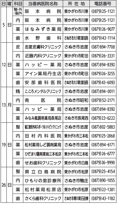○急な病気やけがなどの相談や休日当番医の詳細情報については、さぬき市ホームページの【くらしの情報】→【健康・福祉】→【一般健康情報】→【救急相談】をご覧ください。