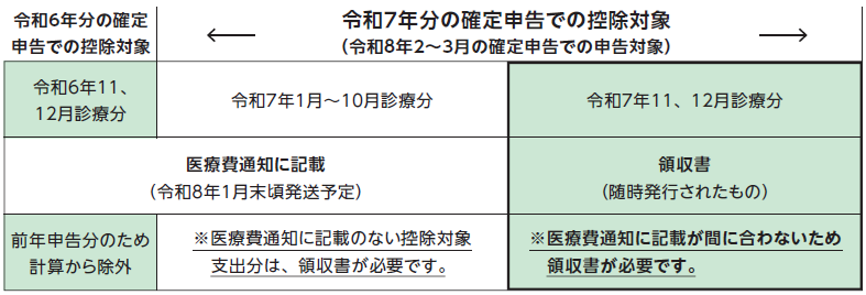 医療費控除に必要な内容がすべて記載されているわけではありません。(本来の目的とは異なるため)そのため、医療費通知(令和8年1月末発行予定)とあわせて従来通り領収書を保管していただく必要があります。