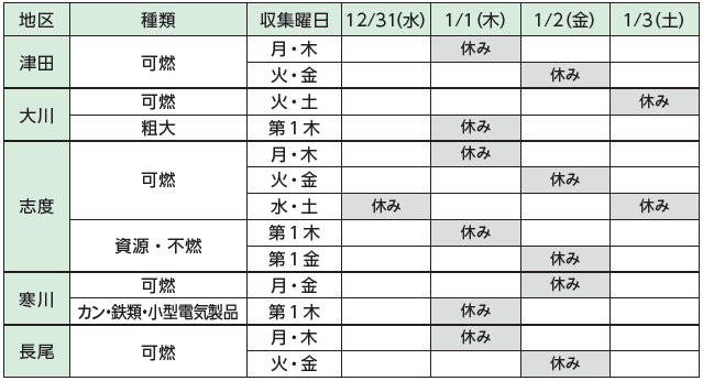 くらし 大掃除は収集日を確認して計画的に!年末・年始のごみ収集日程表 6/55 前の記事 次の記事 発行日 : 2025年11月20日 自治体名 : 香川県さぬき市 広報紙名 : 広報さぬき 令和7年12月号 12月31日(水)~1月3日(土)のごみ収集は右記のとおりです。 なお、代替収集は行いませんのでご了承ください。 問合せ:生活環境課 【電話】087-894-1119 Tweet シェアする 野焼きは原則禁止です 年末・年始のし尿汲み取り業務日程表