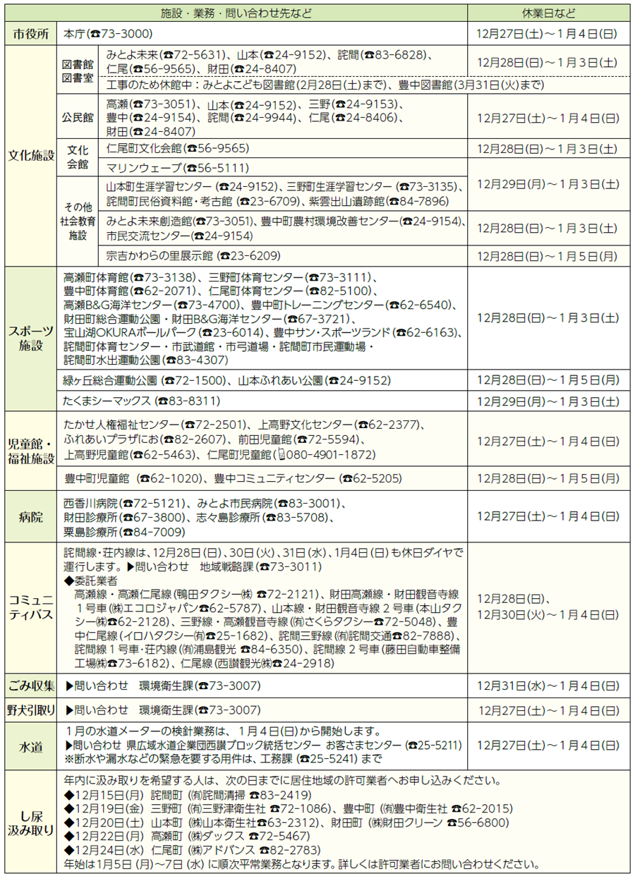 くらし 年末年始業務のお知らせ 4/31 前の記事 次の記事 発行日 : 2025年12月01日 自治体名 : 香川県三豊市 広報紙名 : 広報みとよ 令和7年12月号 市役所や市の関連施設は、年末年始の期間、次のとおりお休みします。 その他の施設は、早めに各施設へお問い合わせください。 Tweet シェアする M’s Information みとよ くらしのおしらせ(1) M’s Information みとよ くらしのおしらせ(2)