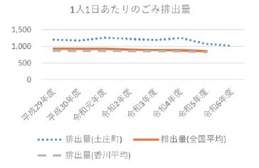 令和6年度の町の家庭ごみ総量を町民ひとり1日あたりに換算すると1,018gで、昨年の1,069gから減少しました。
