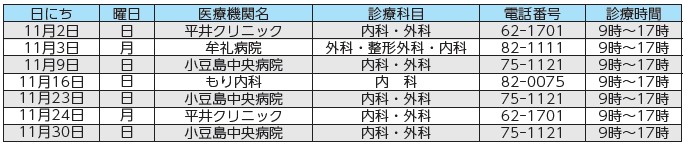 ※直前で変更になる場合がございます。その場合、「医療情報ネット(ナビイ)」、小豆郡医師会のホームページ(【HP】https://www.shozu-med.jp/holidaysdoctor/)にてご確認ください。休憩時間・受付終了時刻は医療機関によって異なりますので、事前に医療機関へお問い合わせください。
