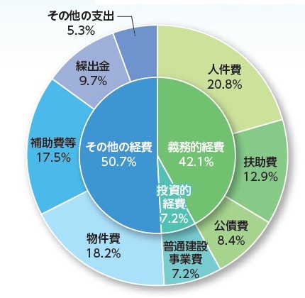 また性質別の歳出構成比で見ると、繰出金が下水道特別会計繰出金の減等により7,814万3千円の減、公債費が長期債元金の減等により2,379万5千円減、貸付金が奨学資金貸与費の減により165万円減となっているのに対して、物件費が四国こんぴら歌舞伎大芝居公演費の増等により4億1,966万1千円増、補助費等が電子地域通貨「KOTOCA」事業費の増等により2億1,372万4千円増、普通建設事業費がいこいの郷公園管理運営費の増等により1億8,699万4千円増、積立金がふるさと納税推進事業費の増等により1億924万3千円増、人件費が商工総務費の増等により6,951万1千円増、維持補修費がいこいの郷公園管理運営費の増等により2,866万2千円増、扶助費が定額減税補足給付金支給事業費の増等により2,481万6千円増、投資及び出資金が上水道費の増により1,246万6千円増となっています。