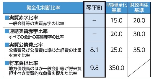財政の早期健全化や再生の必要性を判断するために国が定めている指標です。琴平町の令和6年度における各指標はいずれも国の基準を下回っており、財政状況は良好であると言えます。
