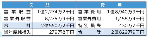 下水道使用料等の営業収益1億2,274万2千円と汚水処理にかかる一般会計からの繰入金等の営業外収益8,275万9千円に対し、維持管理費や減価償却費等の営業費用1億8,940万9千円、企業債利息等の営業外費用1,458万4千円、公営企業会計適用前の消費税等の特別損失が430万7千円となったことから当年度純損失は279万8千円となりました。