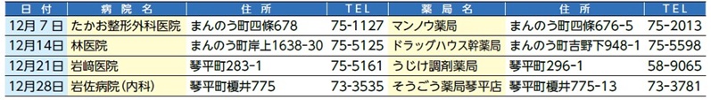 12月の休日当番医・当番薬局変更することがありますので、当日の新聞や電話などでご確認ください。