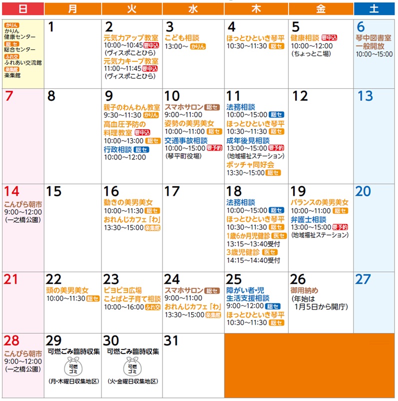 くらし 2025 DECEMBER 12 こんぴらカレンダー 45/46 前の記事 次の記事 記事を読み上げる 発行日 : 2025年12月01日 自治体名 : 香川県琴平町 広報紙名 : 広報ことひら 2025年12月号 行事について:行事の色が青→相談、オレンジ→福祉・保健関係、茶→その他 Tweet シェアする 消費者ホットライン その他のお知らせ(広報ことひら 2025年12月号)