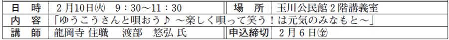 登録団体調書(玉川公民館にあります)に必要事項を記入の上、2月13日(金)までに玉川公民館(玉川地域教育課)へ提出してください。(執務時間中)