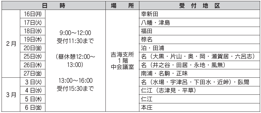 吉海支所では、上記の日程で地域ごとに申告の受け付けを行います。