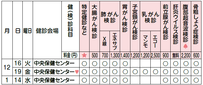 ★特定健診、つるかめ健診(後期高齢者健診)は無料です。30歳代健診は1,000円です。