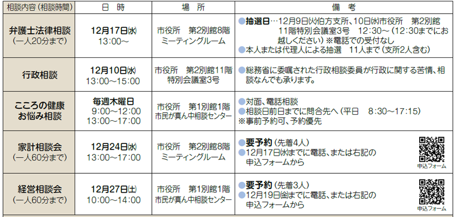 ※各相談会は中止になる場合があります。12月1日(月)以降に問い合わせください。